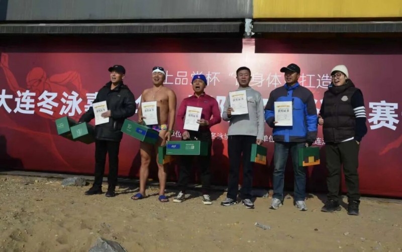 本次比赛设男子、女子25米自由泳与蛙泳项目,按年龄分为60岁以上老年组和60岁以下中年组,共8个组别。所有选手均为大连市冬泳协会注册会员,从报名到参赛全程踊跃投入,体现出赛事深厚的群众基础和专业的组织水平。队员们统一佩戴印有“上品堂”字样的白色泳帽和橙色安全浮球,在星海湾跨海大桥的见证下以“扛造之躯”奋力逐浪。经过激烈角逐,每组前五名选手获得由上品堂提供的有机鲜炖海参及五谷礼盒奖励,所有参赛者均获赠海参鲜炖体验券,让运动的激情与健康的馈赠紧密相连。获奖选手手捧奖品、笑容洋溢,与上品堂企业代表合影留念。
